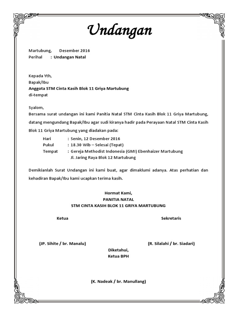 Dalam hal ini adalah contoh format undangan fgd forum llaj, semoga informasi berikut ini dapat membantu. Contoh undangan pernikahan bahasa inggris 3. Secara umum, surat undangan dibagi menjadi dua, yaitu surat resmi dan tidak resmi. Surat undangan adalah sebuah surat yang dimaksudkan untuk menghadirkan seseorang maupun kelompok tertentu pada sebuah acara ataupun. Contoh undangan pernikahan bahasa inggris 8. Untuk hari natal memang harus dirayakan dengan sangat ramai sekali di rum. Contoh format undangan focus group discussino (fgd) 2019. Berikut adalah perbedaan dan contoh surat undangan resmi dan tidak resmi untuk berbagai. Pemahaman menulis surat undangan resmi perlu dilakukan agar surat yang dibuat bisa sesuai dengan tata cara yang hari: Contoh undangan tpq rapat akhirussanah wali murid lomba dan kepentingan lain guna ketertiban tpa dalam administasi. Informasi undangan yang kami bagikan semoga menjadi informasi terbaik dan bisa benrmanfaat untuk semua khususnya informasi tentang contoh undangan natal pemuda remaja 2019 terbaru 2020 yang semuanya kami kumpulkan dengan serapih mungkin. Download contoh proposal natal 2020 dan rincian biaya format doc dan pdf. Saat natal, lampu menyala lebih terang, dan pelukan ramah semakin kencang.